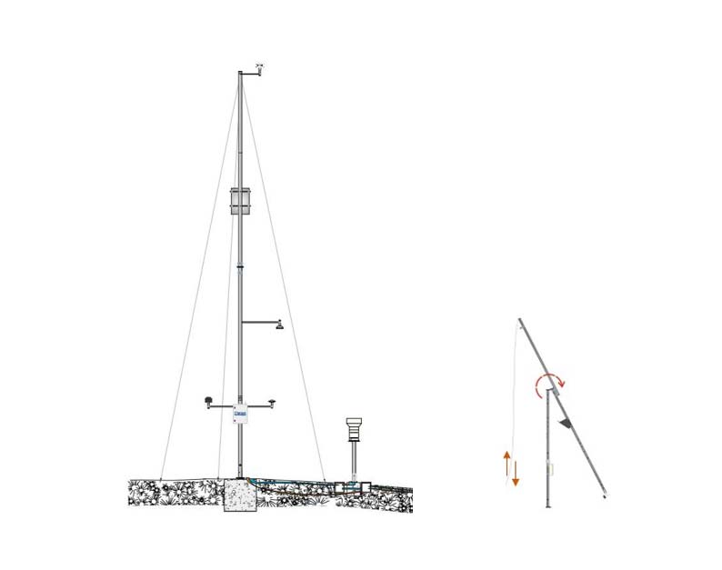 Palo da 10 metri in alluminio anticorrosione anodizzato argento, composto di 4 sezioni da 2×2 e 2x3m, diametro 80mm. Il palo è facilmente innalzabile (peso complessivo 27Kg) e dispone di una cerniera al centro (a 5m) a cui viene fissato un apposito bilanciere che permette un facile ribaltamento del palo per poter agire o far manutenzione alla strumentazione posta alla sommità.